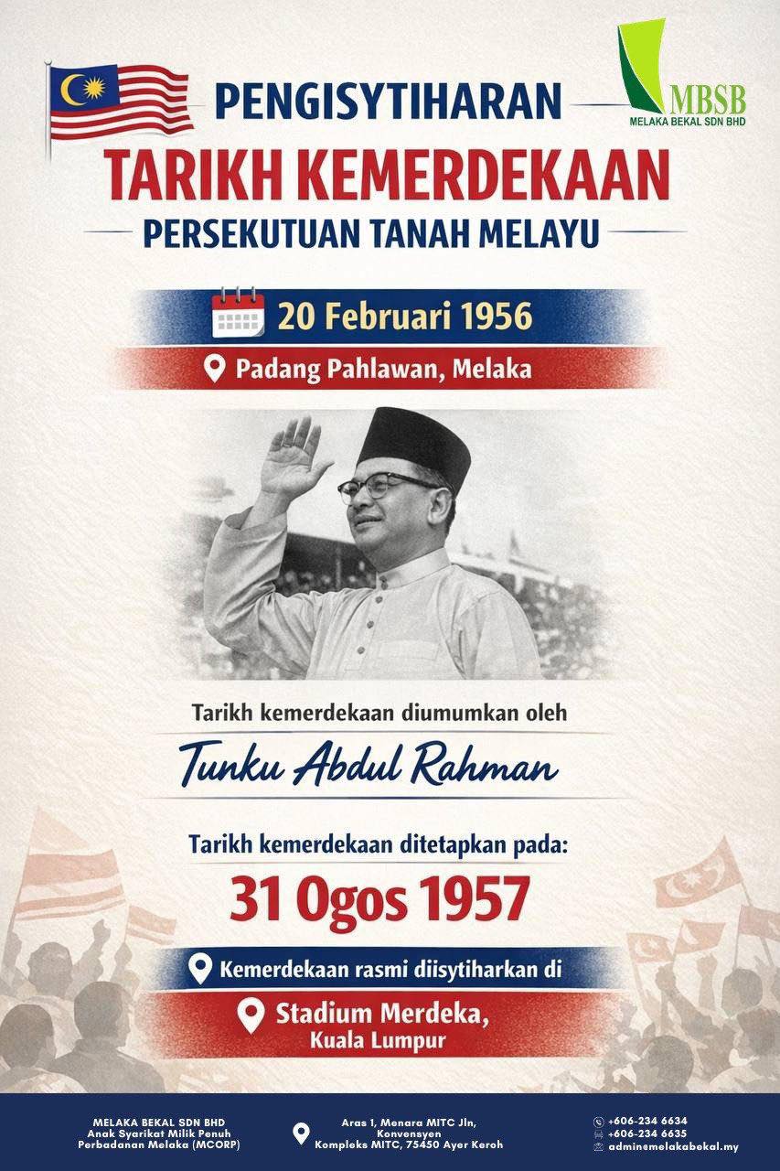 Pada 20 Februari 1956 di Padang Pahlawan, Melaka, tarikh kemerdekaan telah diumumkan oleh Tunku Abdul Rahman, sebelum dimasyhurkan secara rasmi pada 31 Ogos 1957 di Stadium Merdeka.